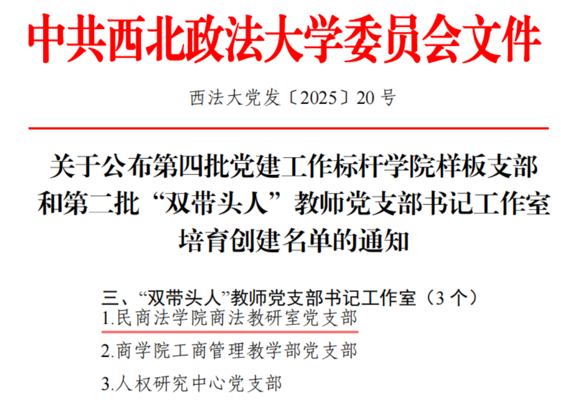 近日,学校公布了第四批党建工作标杆皇冠体育 样板支部和第二批“双带头人”教师党支部书记工作室培育创建名单。皇冠体育 商法教研室党支部获批西北政法大学第二批“双带头人”教师党支部书记工作室。