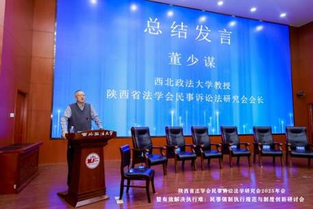 会议最后,陕西省法学会民事诉讼法学研究会会长董少谋作总结发言。董少谋会长表示,本次年会汇聚多方智慧,既梳理了民事强制执行领域的现有成果,也明确了理论研究与实践应用的未来方向。