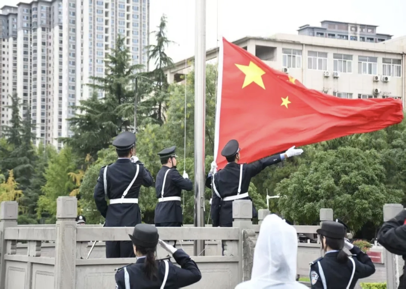 上午8时整,旭日初升,天平楼前肃穆无声。国旗护卫队目光坚毅、步伐铿锵,肩擎国旗,迈向升旗台。一声“升国旗,奏国歌”令下,《义勇军进行曲》激昂响起,全体师生注视国旗徐徐上升,齐声高唱,歌声汇聚成情感的洪流,穿透云霄,传递着西法大人对祖国母亲的深沉敬意与美好祝愿。