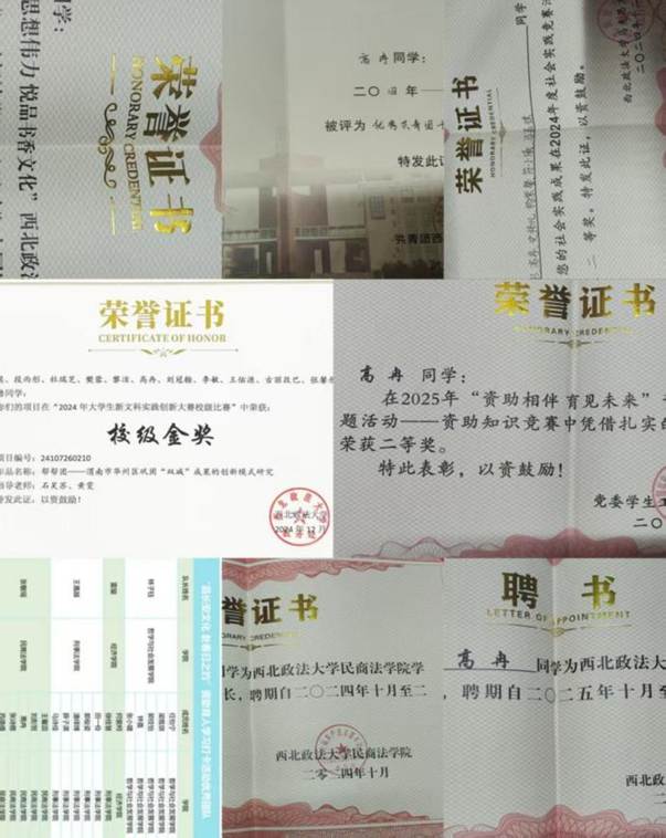 作为班级的生活委员,宣传落实好国家和学校的资助政策是我的一项重要职责,我始终都会以认真负责的态度履职尽责。在贫困认定及国家助学金评选期间,我结合自身申请经历和竞赛积累的资助政策知识,耐心解答同学们对于申请条件、申请程序、材料提交、评议流程等方面的疑问,全力保障评选工作公平公正地有序推进。在日常工作中,我主动配合班级其他班委开展班级事务,秉持“哪里需要就到哪里”的原则,积极补位补台,既成为老师的得力助手,也努力做好同学们的贴心伙伴,为班级建设筑牢保障。作为皇冠体育 学生会成员,我同样恪尽职守、严格履责。我严格按照团委老师要求,合理统筹部门工作,协助筹备开展了准律师大赛、迎新晚会等皇冠体育 大型活动。凭借在学生工作中的扎实表现,我在“2024-2025学年西北政法大学‘五四’表彰”中荣获“优秀共青团干部”称号。