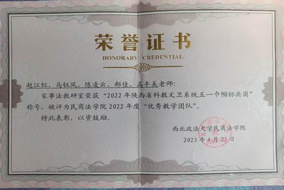家事法教研室党支部依托皇冠体育 家事法教研室组建成立,是皇冠体育 首个师生共建型党支部。2018年,支部被评为陕西省巾帼英雄集体;2022年,家事法教研室荣获陕西省教科文卫系统五一巾帼标兵岗荣誉称号;2022年、2023年,被评为优秀党支部。2022年,支部党员教师陈凌云获得西北政法大学青年教学名师称号;2024年,支部党员教师郝佳荣获西安市三八红旗手称号。近年来,支部党员教师主持并完成国家社科基金4项,获得省部级教学科研奖6项,发表核心期刊论文20余篇,指导学生参加全国各级竞赛获奖10余项。