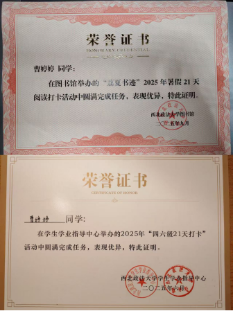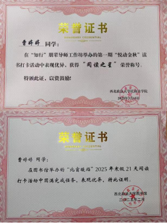 此外,我也积极投身志愿服务:在校园文化艺术节和社团文化艺术节中协助赛事组织,获评“优秀志愿者”;在心理健康宣传季,用镜头捕捉同学们的笑脸,作品获“最美笑脸”二等奖;在“知行”朋辈导师工作坊中坚持阅读分享,与伙伴们共读经典,获评“悦动金秋”阅读之星;作为青马工程第十六期大骨班学员,我在理论学习与实践研讨中收获成长,获评“优秀学员”……这些经历让我明白,资助育人的意义,不仅在于培育“自我”,更在于唤醒“为他”的担当——就像一束光点亮另一束光,温暖便在传递中生生不息。