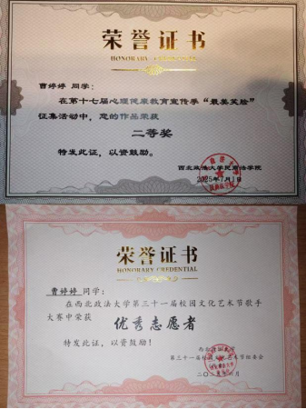 受到帮助的人,更懂得传递温暖。我陆续担任班级宣传委员、社联宣传部部长、《西部法苑》编务等职务,在这些岗位上,我深深感受到“被需要”也是一种幸福。为记录班级点滴,我认真撰写每一篇推送,参与皇冠体育 公众号运营,用文字和镜头留住大家的笑脸与汗水。这些付出也带来了温暖的回报——所在宿舍获评“崇法守规文明宿舍”,班级在多项活动中展现凝聚力。在社联宣传部,我策划活动海报、组织校园宣传,从社团招新到“社团之夜”,我和同事们一起用创意点燃校园活力,获评多项“先进个人”。在《西部法苑》编辑部,我认真审稿、参与读书讨论会与学术讨论会,那些关于法治精神的探讨、关于社会现实的思考,让我体会到文字工作与法学的严谨与美好。