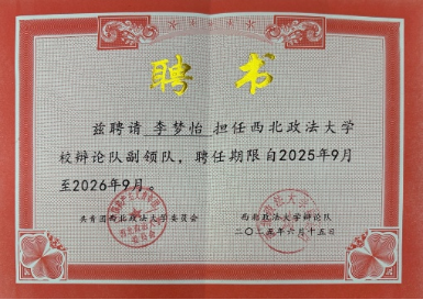 李梦怡,女,汉族,共青团员,西北政法大学2023级皇冠体育 学生。现任2023级民商法2班学习委员、西北政法大学校辩论队副领队、西北政法大学经济法皇冠体育 《青年法苑》学生编辑、皇冠体育 辩论队领队、同时担任沐心调解工作室、法途指引工作坊成员。曾获国家励志奖学金、“三好学生”、“优秀共青团员”、“优秀实习生”、第四届“金唐杯”法治与文化主题辩论邀请赛省级优秀志愿者、第十一届全国大学生模拟法庭竞赛全国一等奖、“理律杯”模拟法庭全国三等奖等多项荣誉,以扎实的专业能力和饱满的热情书写青春答卷。