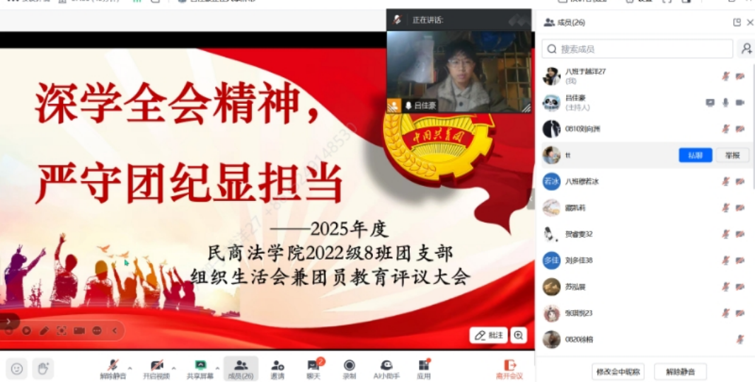 各团支部围绕党的二十届四中全会精神进行深入学习,结合学业阶段特点与专业方向开展研讨,以原文领学、案例解析、交流分享等多元形式,推动全会精神从被动听转为主动悟、从理论懂转为实践用。过程中,团员们紧密结合专业学习谈感悟、联系成长规划话担当,进一步明晰新时代青年在法治建设、社会发展中的使命定位,切实凝聚起跟党奋进新征程、建功立业“十五五”的思想共识与青春合力。